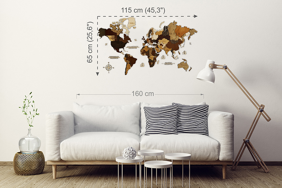 Ξύλινος τρισδιάστατος παγκόσμιος χάρτης τοίχου - (115 x 65) / Με αγγλικά ονόματα